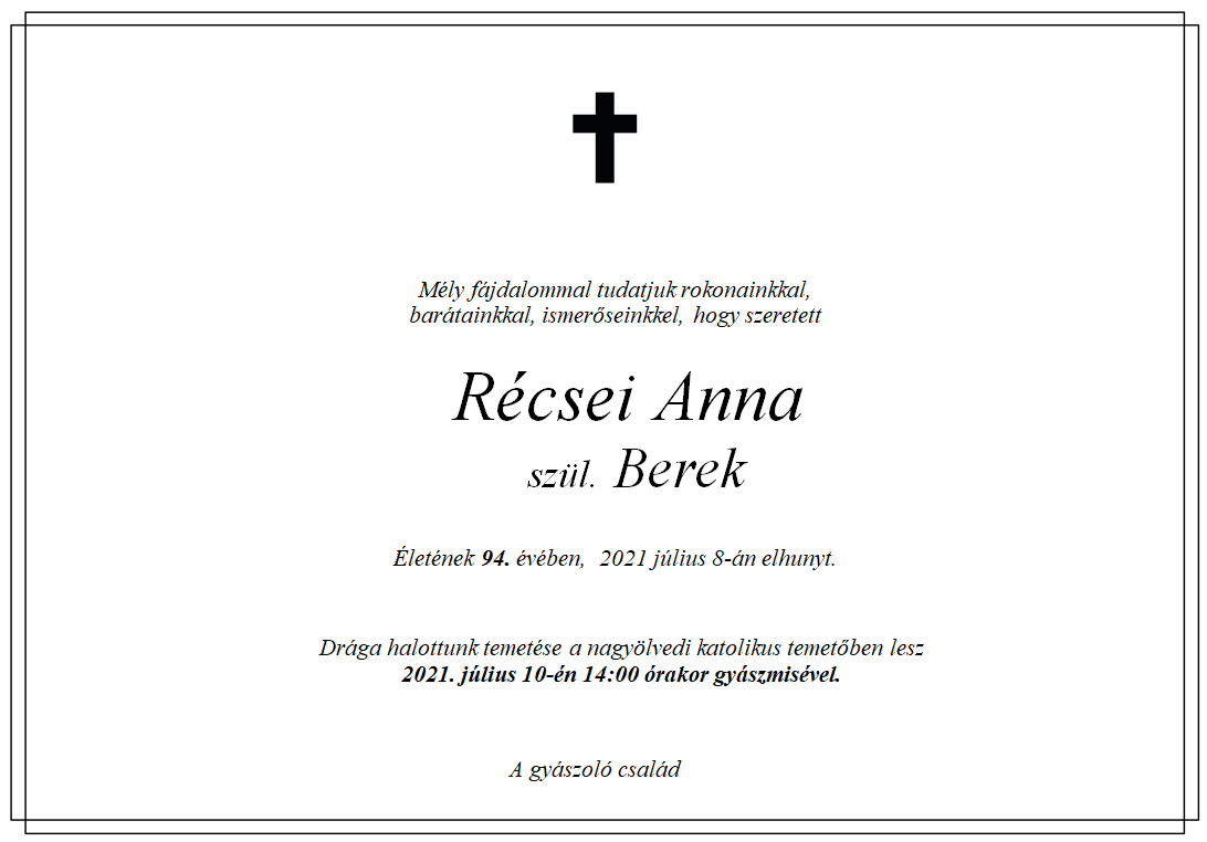 Aktuality - Récsei Anna - Gyászjelentés